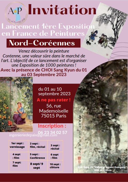 Nous sommes heureux de vous annoncer que nous organisons une exposition spéciale mettant en lumière la fascinante culture nord-coréenne. Cet événement unique en son genre vise à faire découvrir au public les aspects artistiques d'un pays souvent méconnu. L'exposition présentera une riche collection d'œuvres d'art, vous aurez l'occasion de vous immerger dans la beauté de l'art nord-coréen, de comprendre son histoire millénaire et d'apprécier les coutumes qui font de ce pays une véritable pépite culturelle.